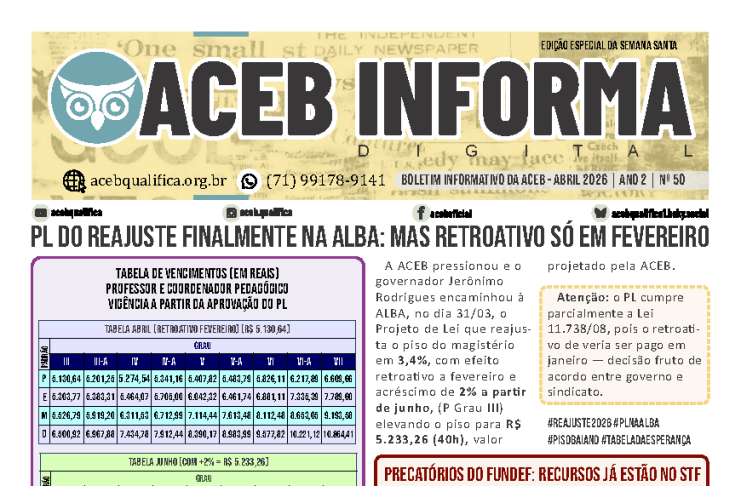 Live ACEB 172 - Episódio 116 | Quinta-feira (02/04)Chegamos à Live 172 da ACEB e seguimos firmes no nosso encontro semanal de informação e esclarecimento para a categoria. Nesta edição, vamos atualizar o debate sobre o Acordo do Piso, tratar do reajuste do magistério para 2026 anunciado pela ACEB de forma pioneira, discutir os impactos do Tema 1218 para a carreira docente e avançar na luta pela reclassificação real, para que cada professor e professora ocupe, de fato, o lugar que lhe corresponde na tabela.SERVIÇO