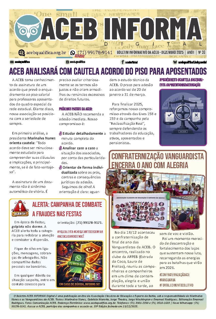 O Boletim ACEB INFORMA Digital é a publicação oficial da Associação Classista de Educação e Esporte da Bahia, trazendo informações atualizadas sobre as lutas pela valorização do magistério, campanhas salariais e os direitos dos profissionais da educação baiana.