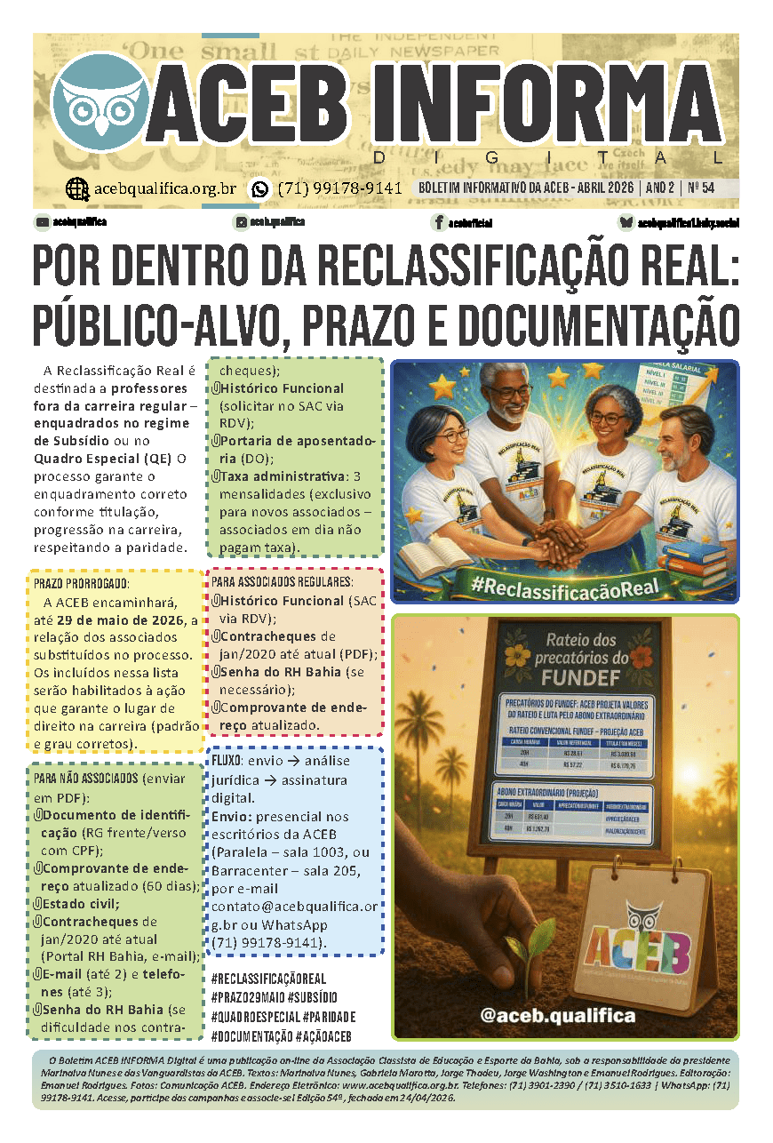 Já está disponível a Edição 54 do Boletim ACEB Informa Digital, um guia prático e direto sobre as duas principais frentes de luta da categoria neste momento: os critérios e os documentos para a Reclassificação Real e a atual situação dos precatórios do FUNDEF, com o rateio convencional e o abono extraordinário.