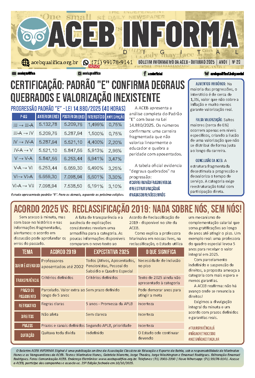 #BoletimACEB29 #ACEBInforma #CarreiraNãoFragmentada #TransparênciaJá #NãoAoAcordoIndefinido #PisoParaTodosJá #NadaSobreNósSemNós