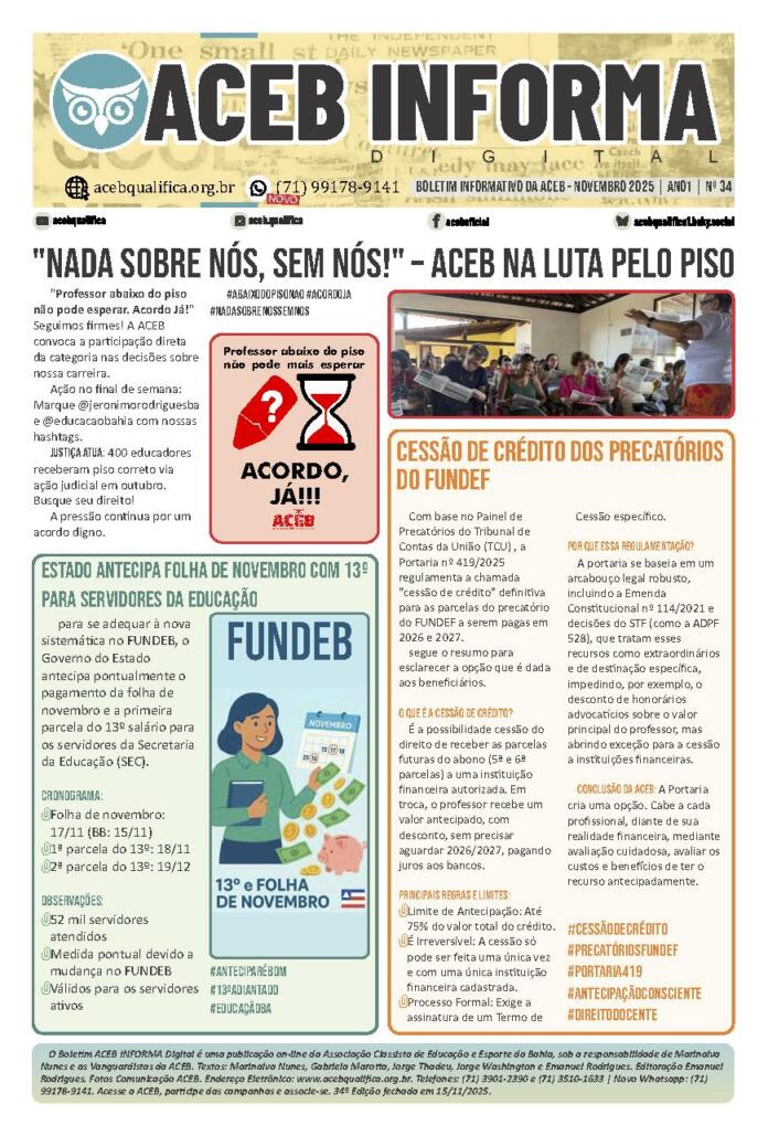 #BoletimACEBInforma #Edição34 #AbaixoDoPisoNão #AcordoJá #CessãoDeCrédito #AntecipaçãoConsciente #DireitoDocente