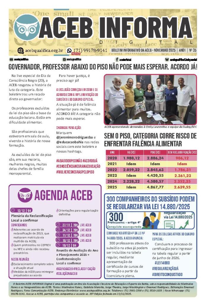 A Associação Classista de Educação e Esporte da Bahia (ACEB) publicou nesta semana a edição nº 35 do Boletim ACEB Informa Digital, trazendo um alerta dramático sobre a situação de professores que estão abaixo do piso salarial e um recado direto ao governador Jerônimo Rodrigues.