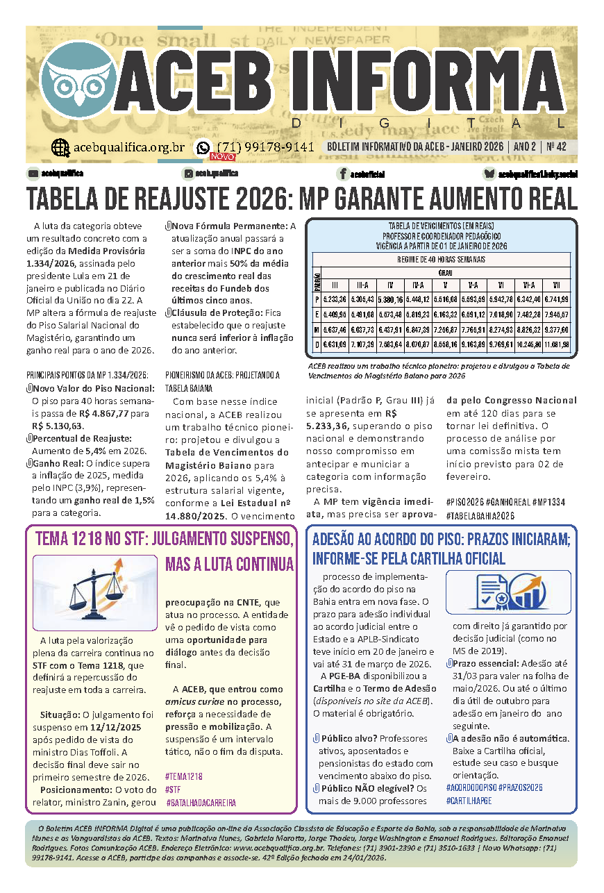 Já está no ar a Edição 42 do Boletim ACEB Informa Digital, dedicada a analisar os movimentos estratégicos que definem a luta pela valorização docente no início de 2026. Em um momento de decisões críticas, este informe traz o detalhamento das conquistas imediatas, dos prazos vigentes e da batalha judicial que moldará o futuro da carreira.