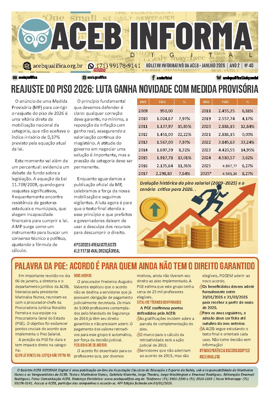 #BoletimACEB #Edição40 #Piso2026 #ReajusteJusto #Lei11738 #ValorizaçãoReal #Transparência #AcordoDoPiso #ACEBNaLuta